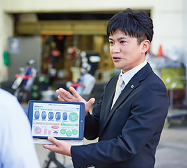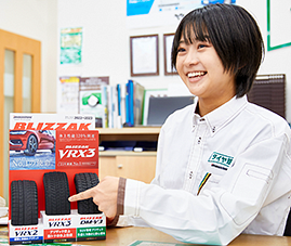 ブリヂストンタイヤの専門商社で、主にタイヤショップ、ガソリンスタンド、カーディーラー、カー用品店といった法人のお客様にタイヤを販売しています。
